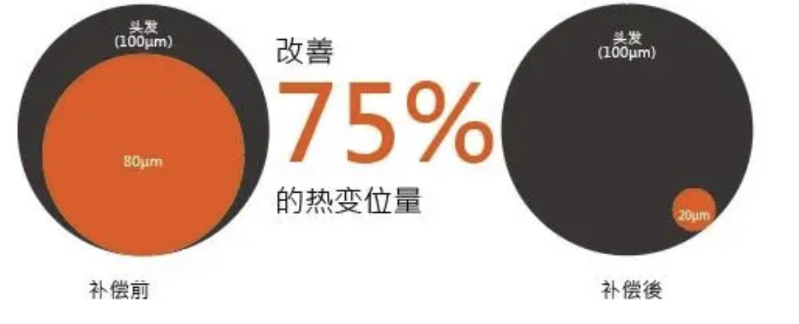 而在有 PT100 與離心誤差補償條件下,即使環(huán)境溫度持續(xù)變化,從冷機啟動運轉2小時后,從實機測試中可以很明顯的得知主軸熱變位量最大值為 20μm。熱變位量明顯改善了 75%。